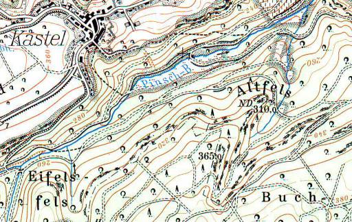 Auf der Nordseite des hier schmalen Rückens, der sich vom Altfelsen nach Westen zieht, liegen einzelne Felsklötze, meist von oben den steilen Hang runtergerollt.