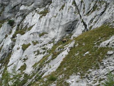 Auch von vereinzelt auftretenden Gemsen (Gämsen, unten links in der Bildmitte) ließen weder wir uns stören, noch ließen die Wiederkäuer sich von der Äsung abhalten, und schon gar nicht vom Wiederkäuen! Das Foto rechts zeigt die Route des Folgetages, hier wird auf dem Steftensteig in ca. 2,5 Stunden der nördliche Teil der Ausläufer der Göll-Westwand zu ersteigen.