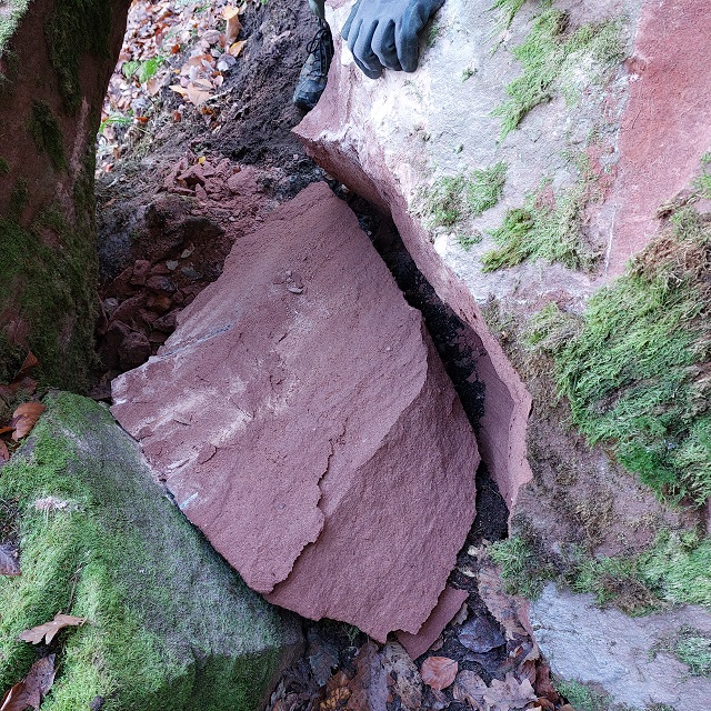 Im November 2022 nahmen wir uns auf einen Wanderweg gefallener Felstrümmer an und legten einen für Durchschnittswanderer geeigneten Durchgang frei. Die Übungen zur Engstellenerweiterung dauerten insgesamt zwei Stunden und erfolgten im wesentlichen mit Spaltkeilen.